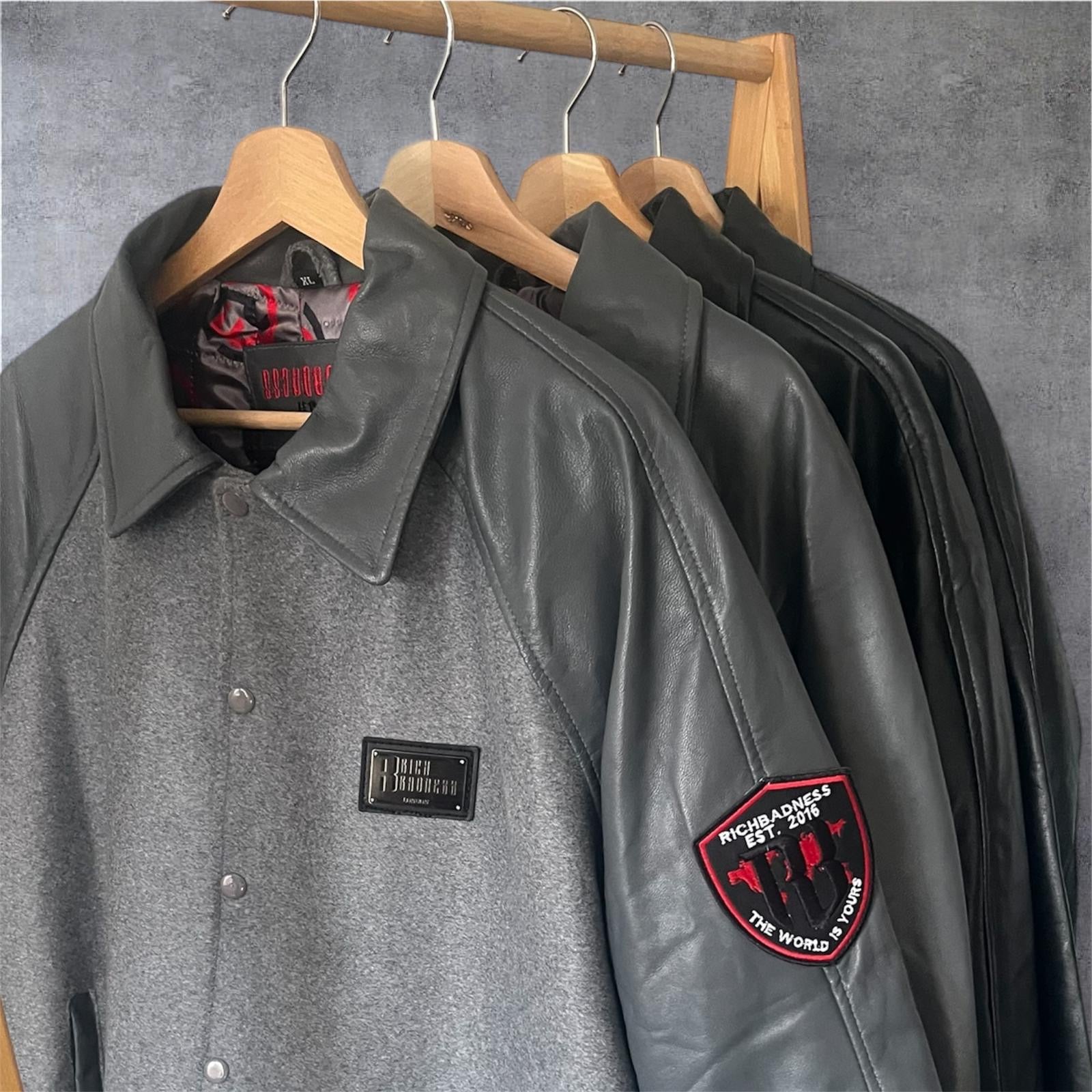 • Classic varsity with a modern edge, featuring a sleek black wool body and genuine leather sleeves for a bold contrast.
